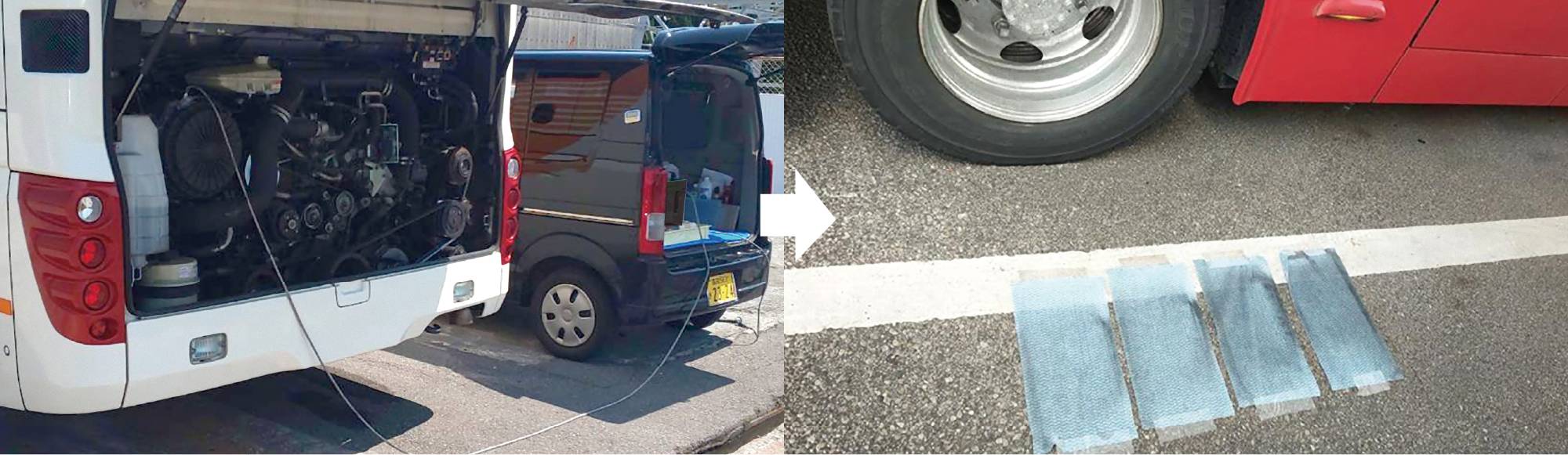 カーボンクリーニング作業中の写真(左)とカーボンが排出された際のあて布(右)